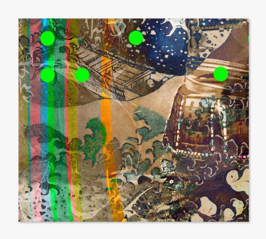 De legendarische prent Kanagawa oki namiura “De grote golf bij Kanagawa” staat centraal in deze collage. Een hoge golf, op het punt van omslaan, in een woelige zee met drie roeibootjes, de golven trotserend; op de achtergrond de berg Fuji. In combinatie met een onbekende foto van een trotse Samurai die de grote golf doorklieft en een bekende ero-manga tekening maakt dit een kleurige en spannende collage. Met acryl verf zijn er op het werk kleine details aangebracht.