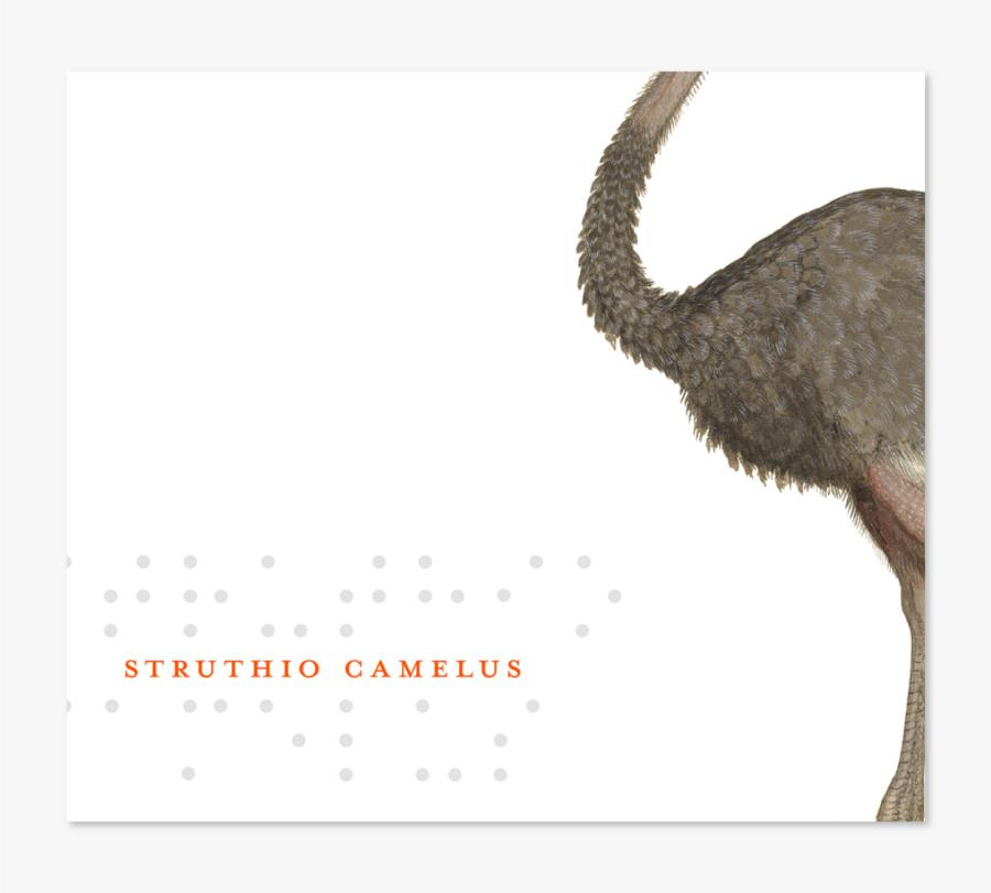In de 16de eeuw maakten kunstenaars – die nog nooit een levende struisvogel hadden gezien – soms de fout het dier vliegend in de lucht weer te geven. Deze kunstenaar tekende de loopvogel zoals het hoorde, stevig met zijn poten op de grond. Ook de details, zoals de fijn geschilderde donsveren en het kale kippenvelletje op de poten zijn bijzonder natuurgetrouw weergegeven. De kop van de struisvogel is met de hand getekend in een digitaal ets techniek en uitgespaard in het oranje vlak dat met zeefdruk techniek is aangebracht. De zeefdruk inkt zorgt voor een mooie diepe en volle kleur oranje.
